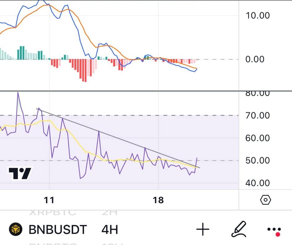 The BNB on the 4-hour showed a positive shift as the Relative Strength Index (RSI) broke above its descending trendline, indicating renewed bullish momentum.