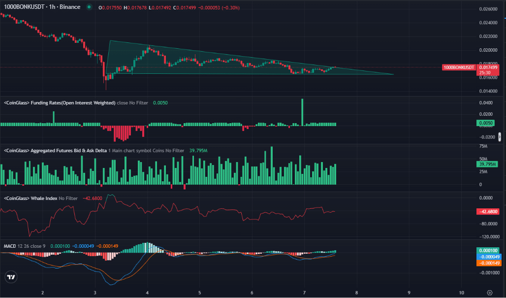 According to AMBCrypto’s analysis, a clear triangle pattern seemed to be forming on the charts – Indicative of a consolidation phase before a breakout. In this phase, the price of BONK has been oscillating between a descending upper resistance and an ascending lower support, with the two lines converging towards the breakout point.