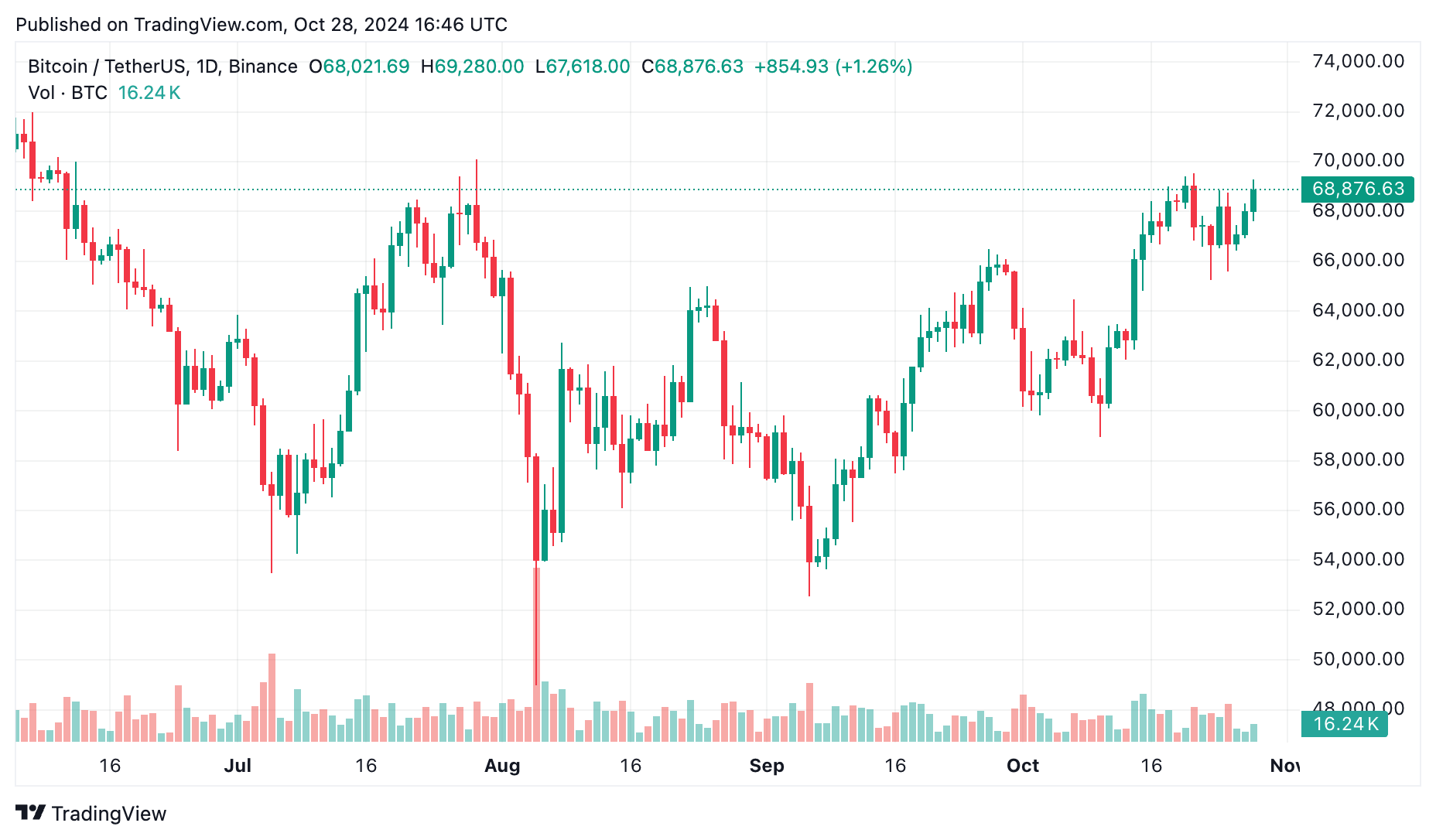 As of Oct. 28, Bitcoin’s price has risen by nearly 2.5% in the past 24 hours, pushing it to around $69,000. Now, it’s inching closer to the $70,000 milestone — a “psychological resistance” level that could shape market sentiment.