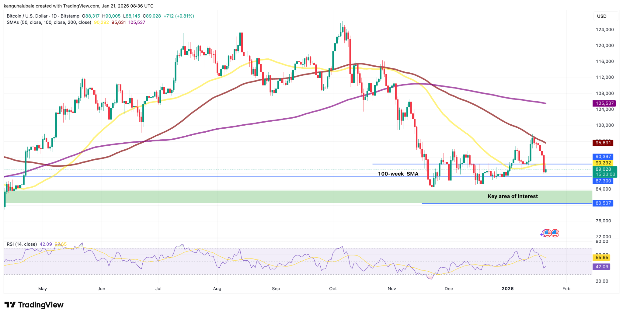 The BTC/USD pair is trading at $89,000 at the time of writing, with the next line of support sitting at $87,300, which is also the 100-week SMA, or simple moving average.