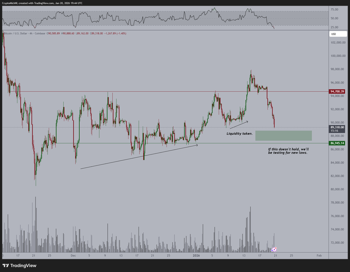 “Bitcoin breaks down into the range and starts to plummet as geopolitics get worse,” MN Capital founder Michael van de Poppe said in an X post on Wednesday.