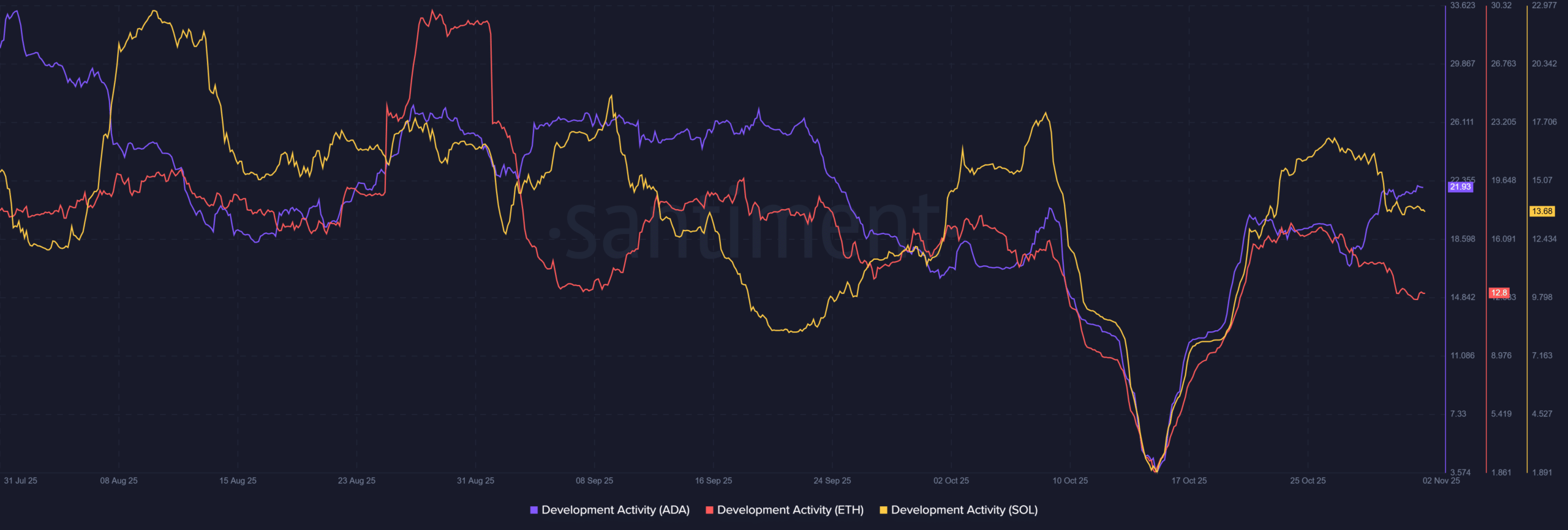 Yet, Santiment data showed Cardano’s Development Activity index surpassed ETH and SOL in late October, proving consistent builder momentum.