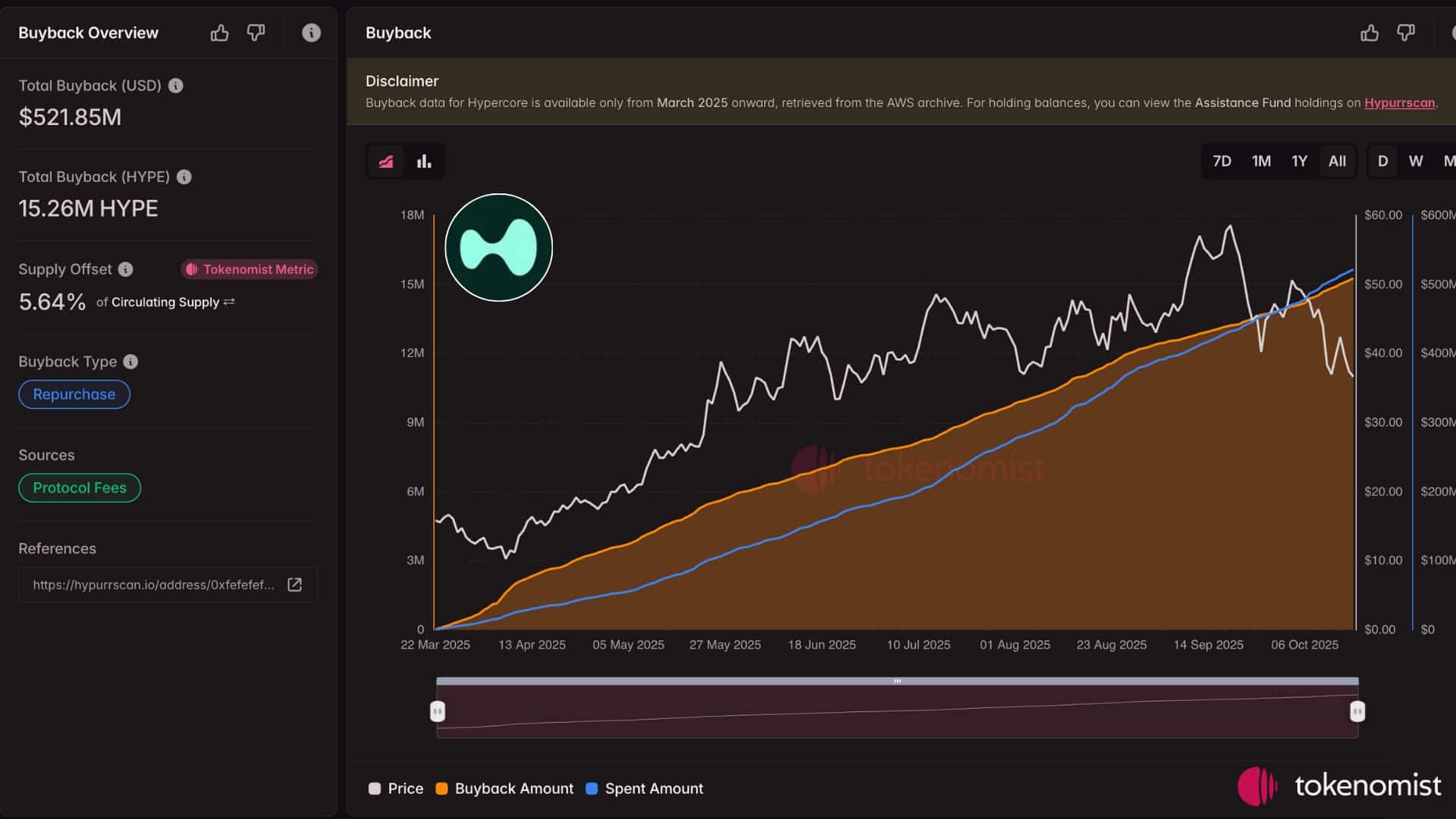 According to Tokenomist data, the HYPE buyback mechanism has accumulated over $522 million worth of tokens since launch, accounting for more than 5.6% of the circulating supply.