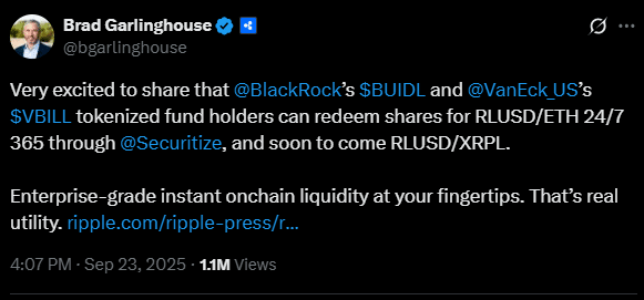 A similar feature will be enabled for VanEck’s tokenized product, VBILL, in the coming days. According to Ripple CEO Brad Garlinghouse, the move was a ‘real utility’ for users to have on-chain liquidity on the go.