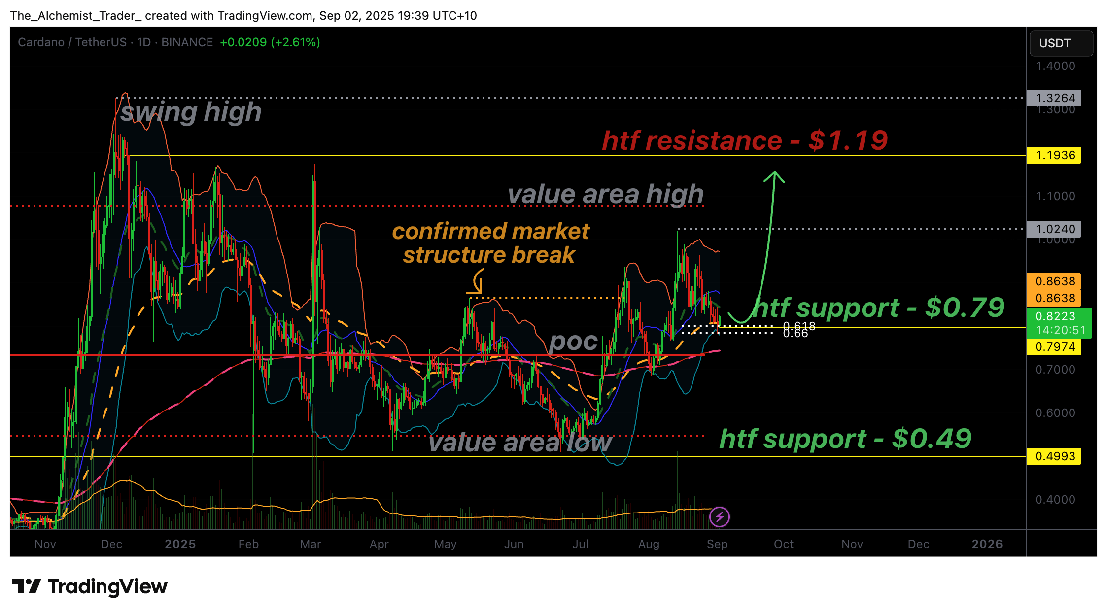 Cardano (ADA) is currently holding firm above a major high time frame support level at $0.79. This zone has multiple technical confluences, reinforcing its importance as a structural foundation for continuation higher. With the Grayscale ADA ETF deadline approaching, Cardano is also eyeing a breakout that could strengthen its bullish outlook. With bullish market structure already confirmed, ADA is positioning itself for a potential move back toward higher resistance levels.