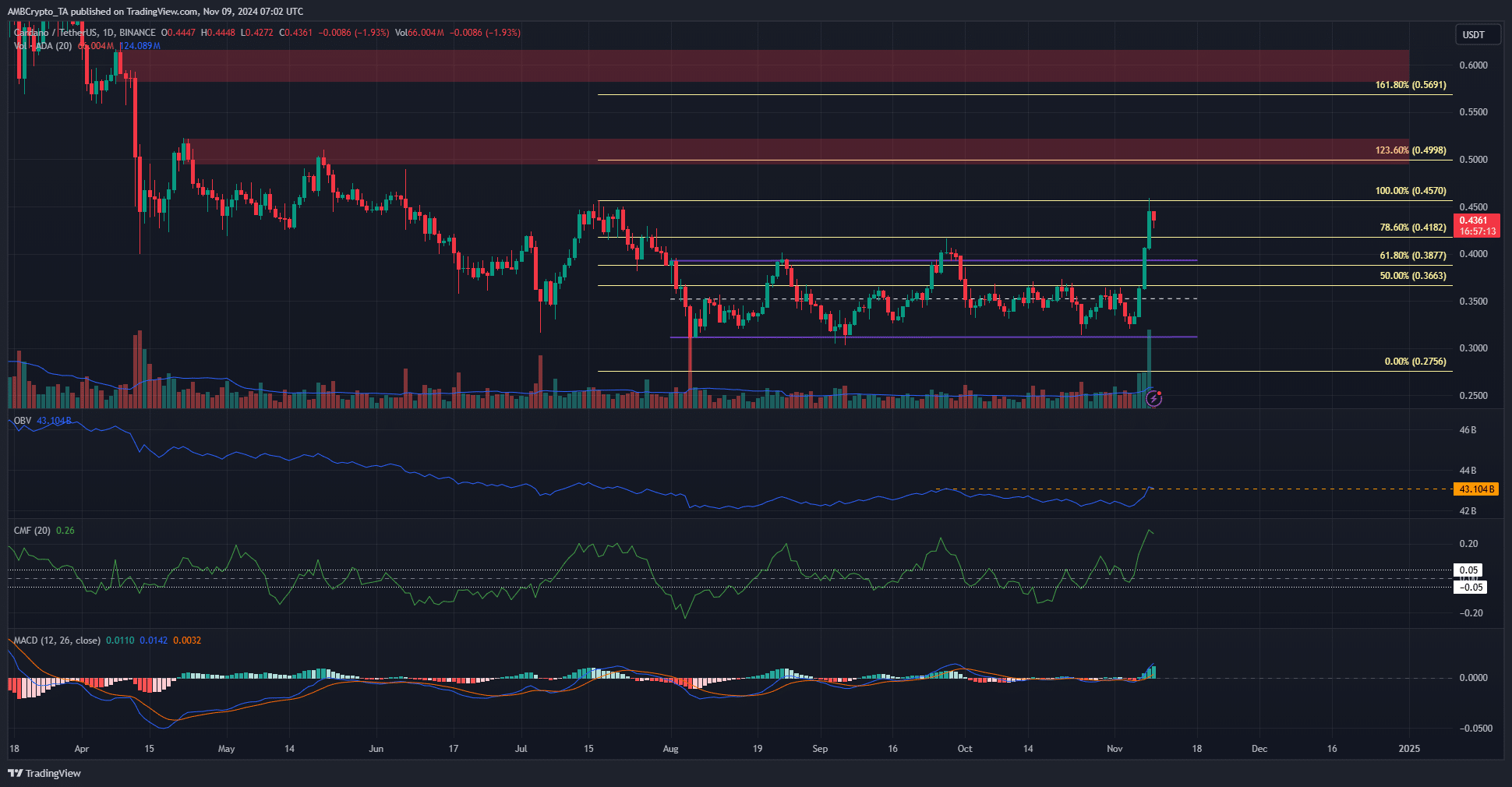 Cardano [ADA] was successful in its range breakout over the past week, gaining by a remarkable 43.3% from Monday’s lows to hit $0.4587. In fact, a recent report highlighted that whale transactions increased by 32% too.