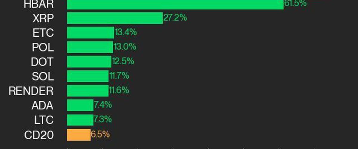 CoinDesk 20 Performance Update: HBAR Gains 13.3%, Leading Index Higher from Monday