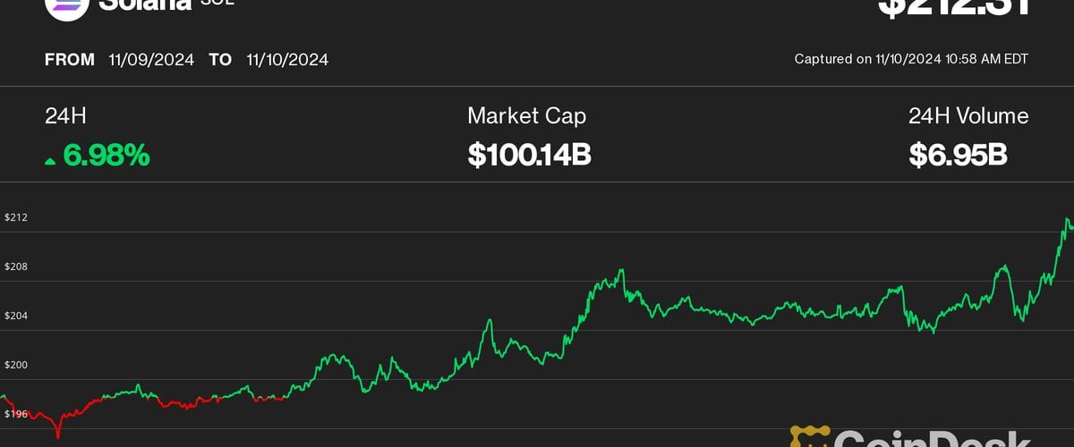Solana Joins $100B Club, Hitting Nearly a Three-Year High Above $210