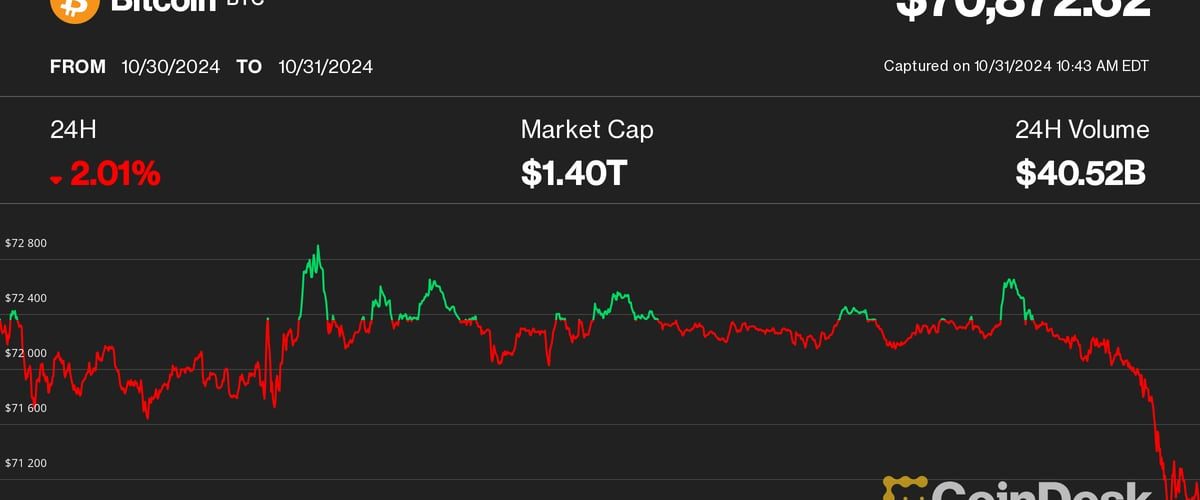 Ether Tumbles 5.8%, Leading Large Crypto Losses, With Bitcoin Sliding Below $71K