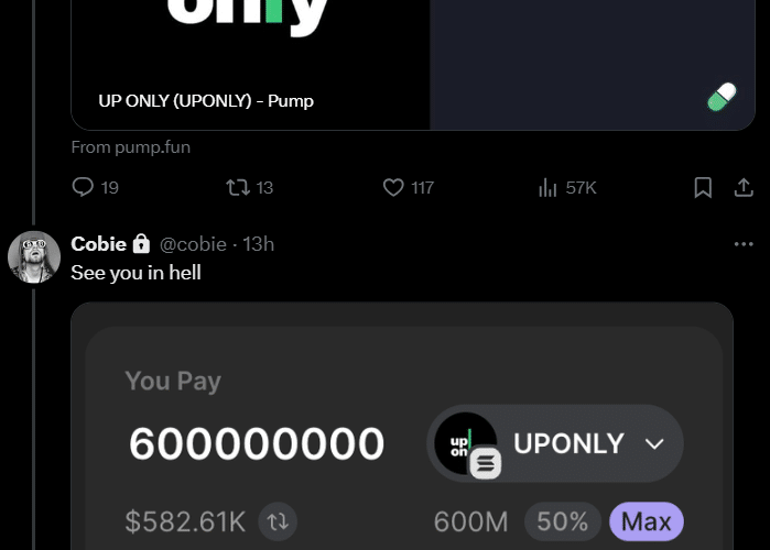 Crypto podcaster Cobie burns 60% of SOL meme ‘UPONLY’