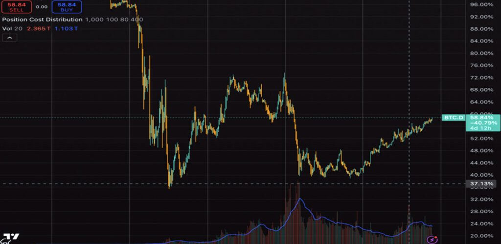 Bitcoin dominance hits new cycle record of 58.8%, highest since 2021