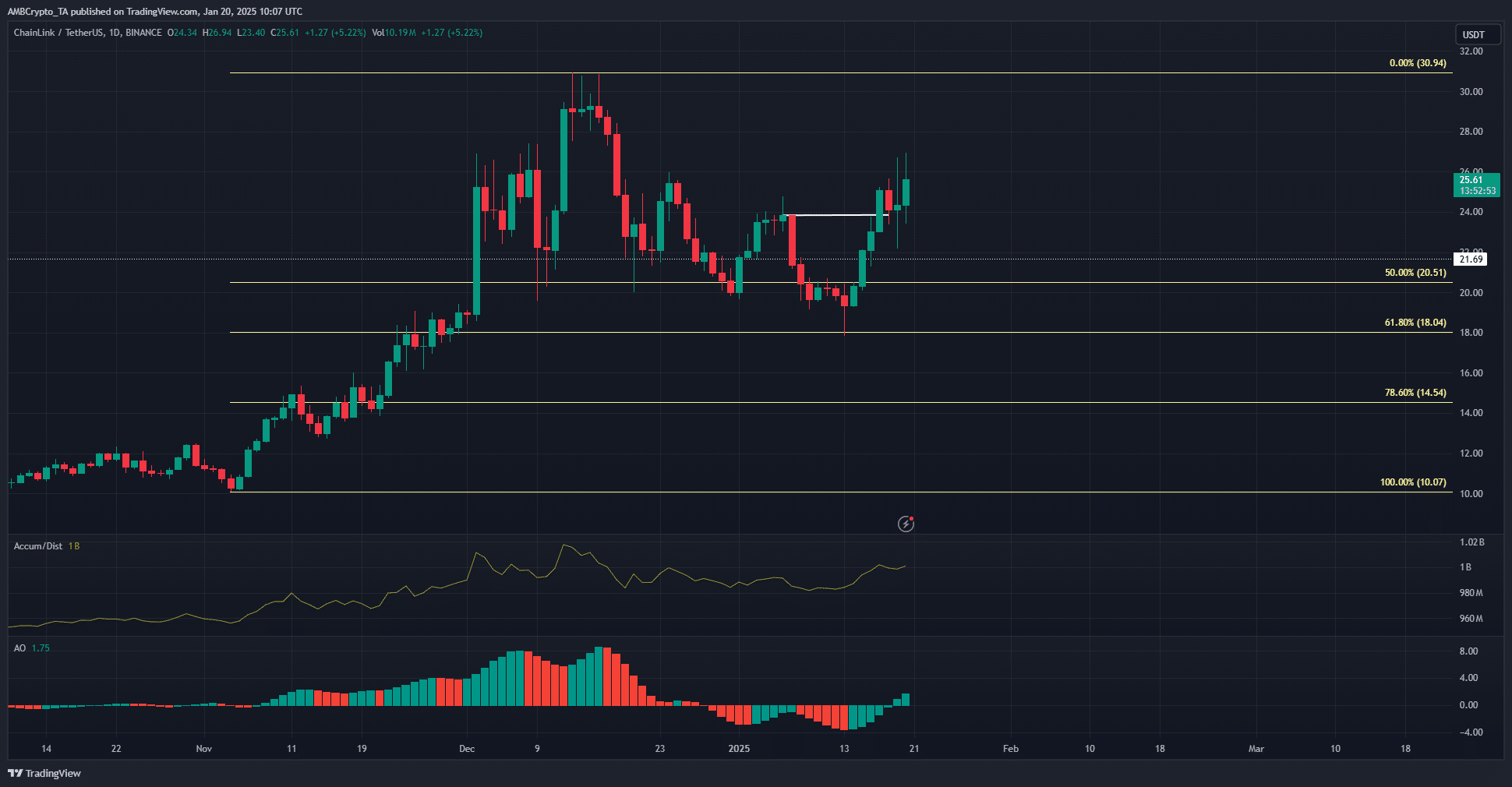 The 61.8% Fibonacci level was retested and the psychological $20 zone was not relinquished despite the bearish sentiment across the market in recent weeks. It was likely that the recovery could turn into an uptrend that could drive Chainlink beyond $31.