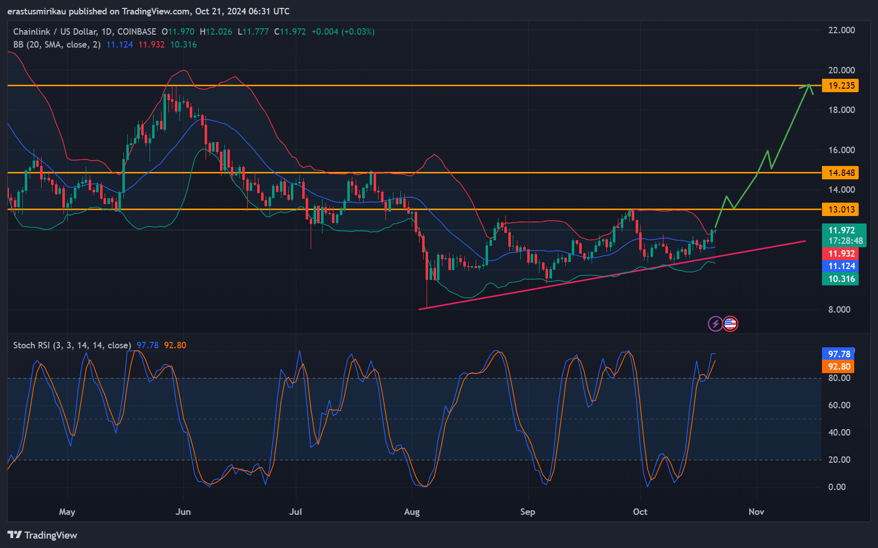 At press time, LINK was trading at $11.96, reflecting a 5.47% surge in the last 24 hours. Consequently, its market cap has risen to $7.50 billion, with a 5.46% increase.