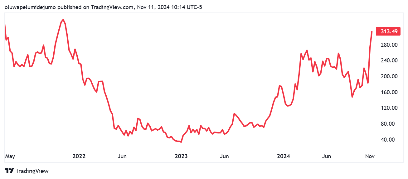Coinbase, the largest crypto trading platform based in the US, has seen its stock climb above $300—a milestone not reached since November 2021.