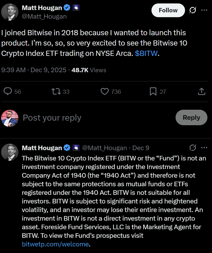 On Dec. 10, Bitwise Asset Management’s 10 Crypto Index Fund (BITW) transitioned from the over-the-counter market to NYSE Arca, broadening its visibility and opening the door to greater institutional participation. The fund is now available as an exchange-traded product.