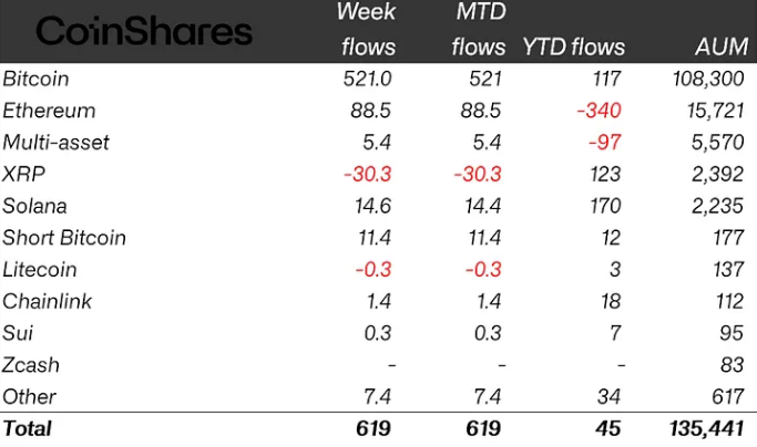 Crypto exchange-traded products (ETPs) recorded $619 million in inflows last week, led by $521 million into Bitcoin (BTC) investment products, CoinShares reported Monday.