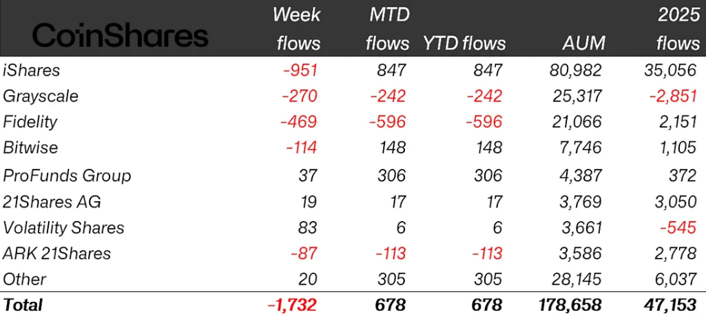 Bitcoin and Ether lead outflows with $1.72 billion combined