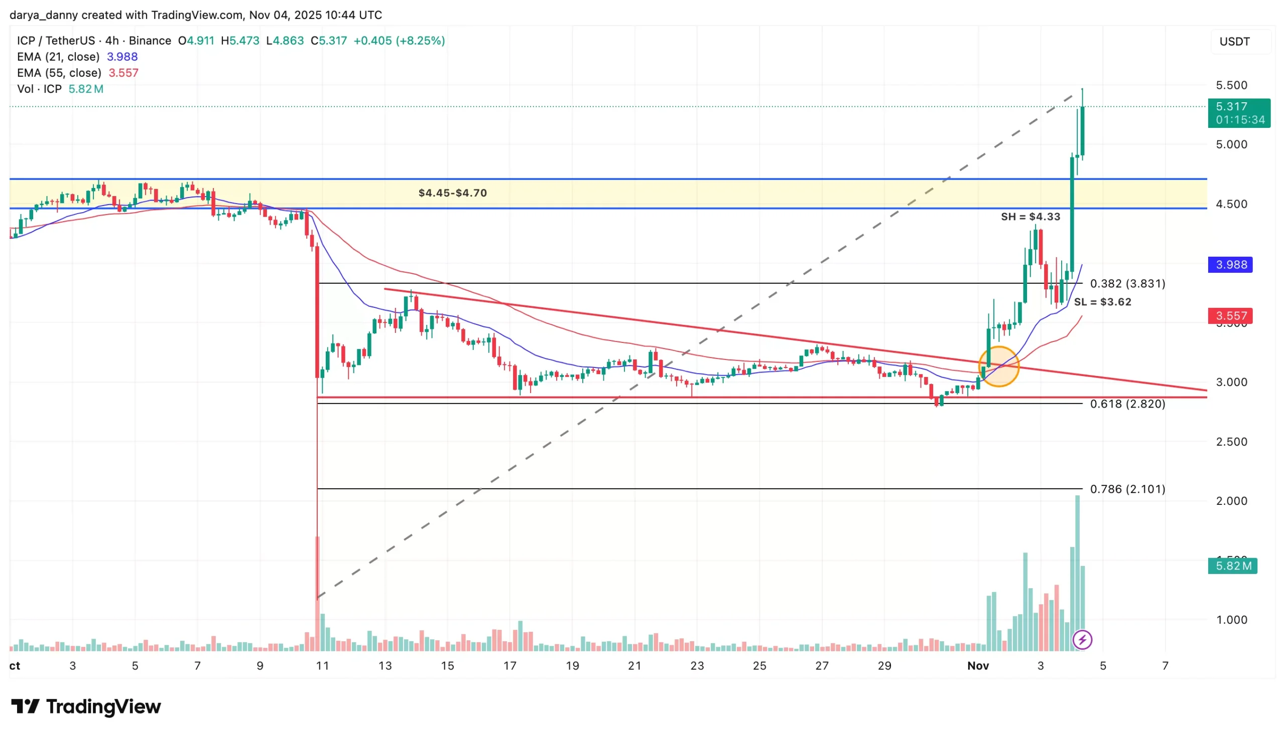 Internet Computer (ICP) price has blasted past the $4.45–$4.70 historical zone, which had been capping upside momentum before the October 10 flash crash.