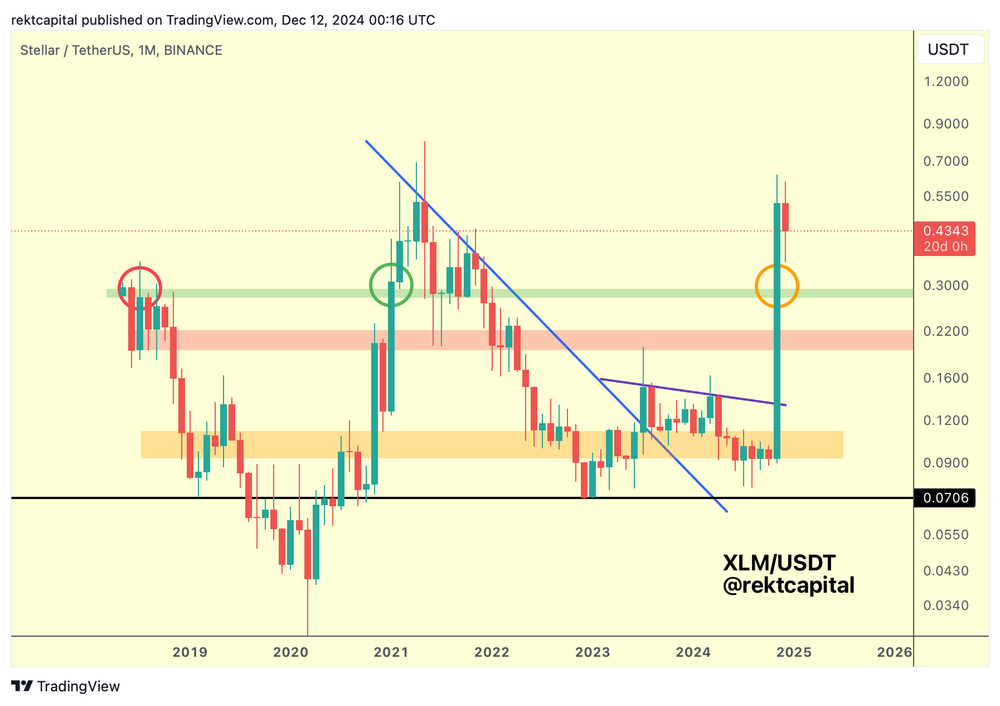 Moving on to the XRP rival Stellar, the analyst says in his newsletter that the digital asset has surpassed one of the most important reference points in terms of price and that any further pullbacks should be a retest of this zone.
