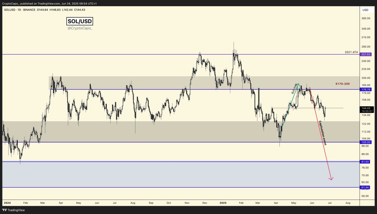 According to Capo, Solana could fall by up to 58% from the current level after failing to break above a level last reached late last month.