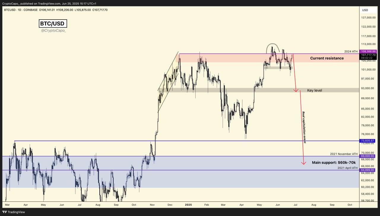 Turning to Bitcoin (BTC), Capo says the crypto king is facing strong resistance at the level just below $109,000. Based on the pseudonymous analyst’s chart of the one-day time frame, it appears Capo is suggesting that Bitcoin could first fall to a support level around the price of $93,000.