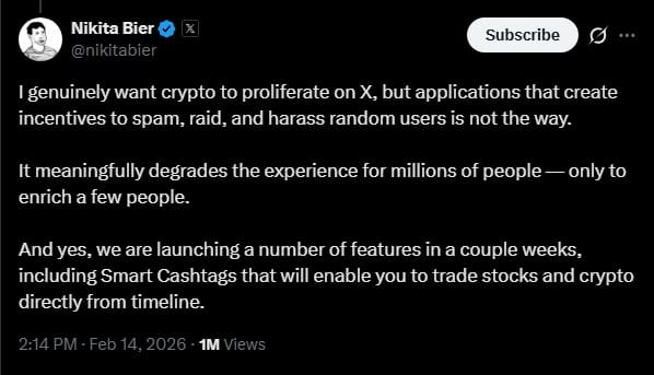 According to Nikita Bier, Head of Product, X will soon roll out a feature called “Smart Cashtags.” These build on the platform’s existing system where users type symbols like $BTC to track assets such as Bitcoin [BTC].
