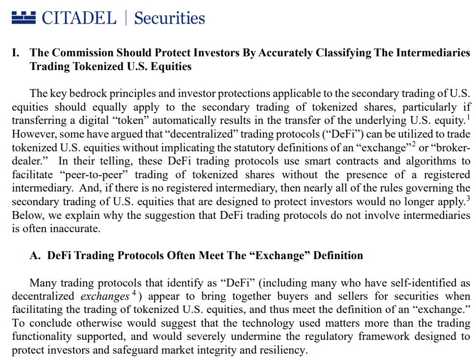 - Citadel is strongly opposed to DeFi platforms being exempt from reporting and transparency obligations while handling tokenized equities.