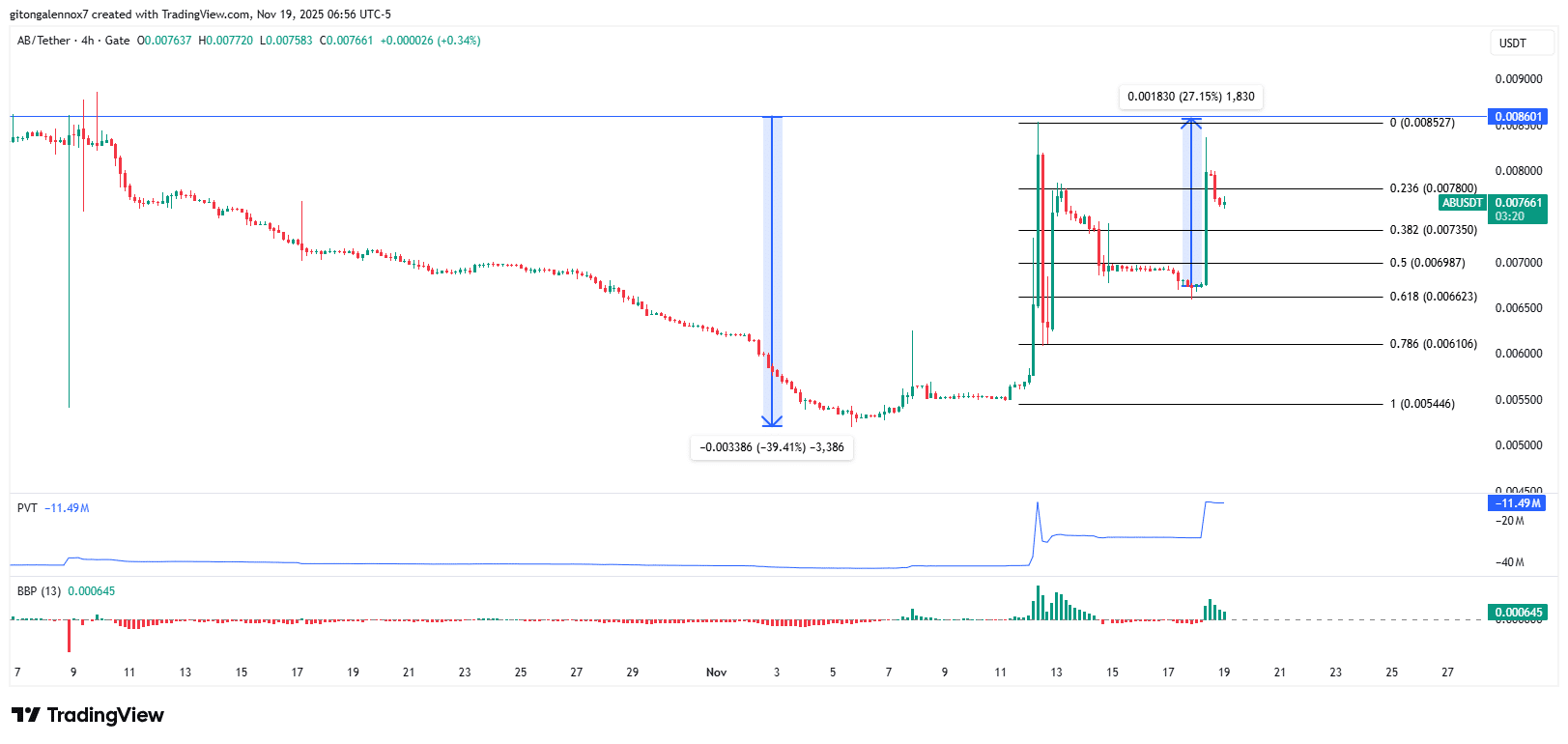 Initially, AB rose from $0.0055 to $0.0085, which represented a 55% move from the low. The rally was driven by the deployment of USD1 by World Liberty Financial [WLFI], as reported earlier by AMBCrypto.