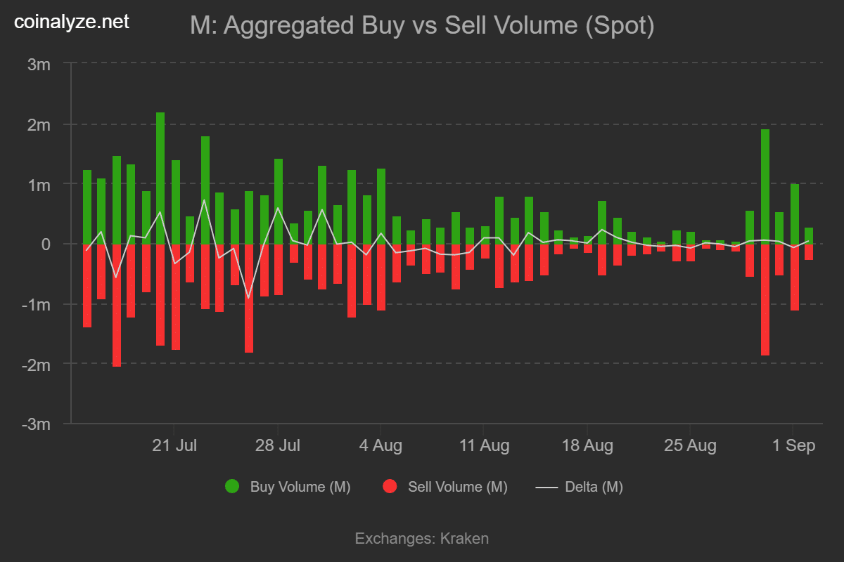 According to Coinalyze, MemeCore saw 291.5k in Buy Volume compared to 257k in Sell Volume. This, in turn, produced a positive Buy-Sell Delta of 33k, a clear marker of renewed buyer dominance.