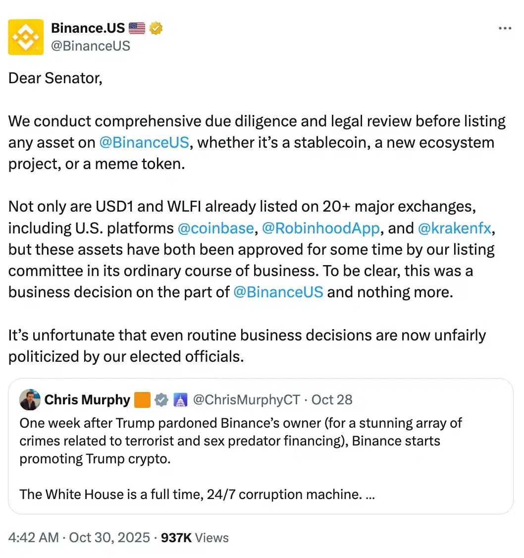 “Does that make sense to you?” he asked Sen. Murphy on X, implying that inconsistency at the regulatory level is a more pressing issue than alleged political favoritism.