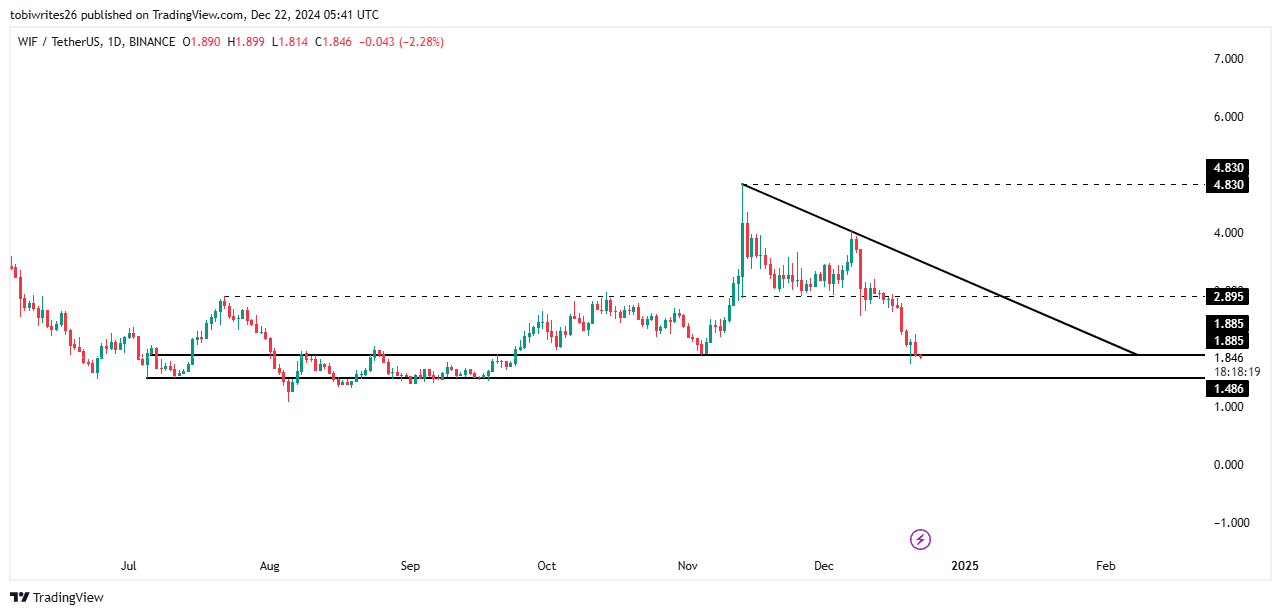 Before any rally materializes, WIF is likely to experience an additional price drop from its current level. The recent 14.69% decline over the past 24 hours may extend further.