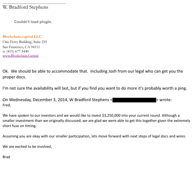 “When we figure out which LLC will be making the $3m investment, we will have them change the name of the investing entity. Wire instructions are also included,” wrote Bradford Stephens, the founder and managing partner of Blockchain Capital, in an email on Dec. 4, 2014, to Darren Indyke, one of Epstein’s known associates.