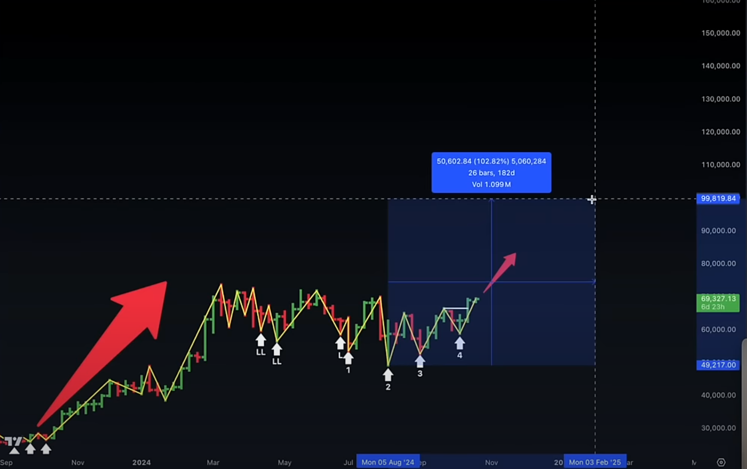 In the past upward move that started around a year ago, the analyst notes that BTC shot up by around 200%.