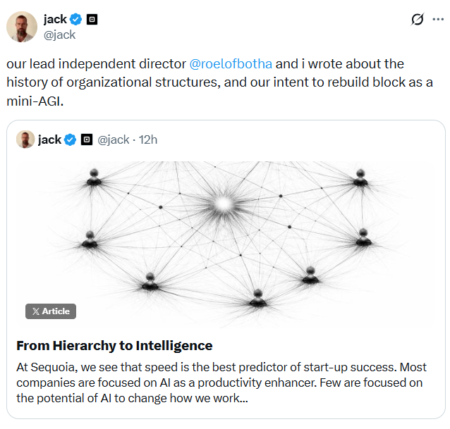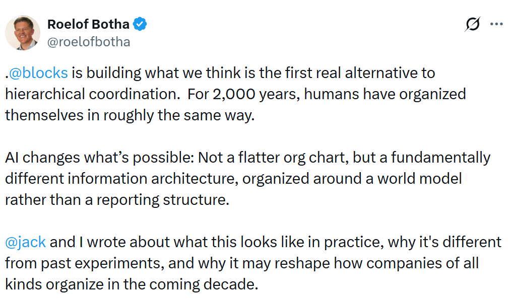 “We believe the pattern behind this, a company organized as an intelligence rather than a hierarchy, is significant enough that it will reshape how companies of all kinds operate over the coming years,” Dorsey and Botha said.