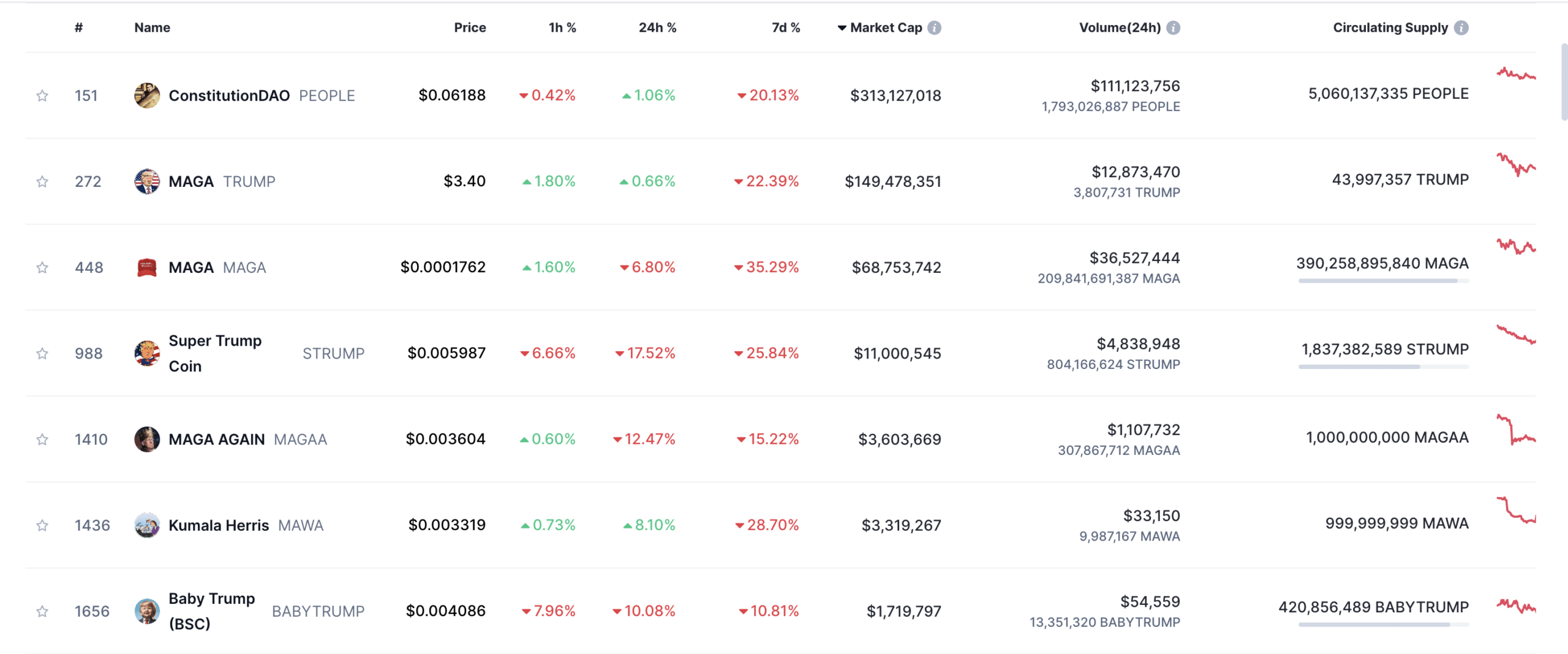 AMBCrypto took a closer look to reveal that in the Trump-themed segment, MAGA (TRUMP) jumped by around 25% and hit a market cap of $167 million. MAGA (MAGA) saw an even stronger hike with gains of approx. 35%, while Doland Tremp (TREMP) climbed by around 18%.