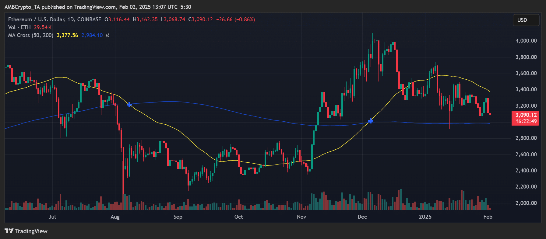 On the other hand, Ethereum traded at $3,090.12 at the time of writing, show