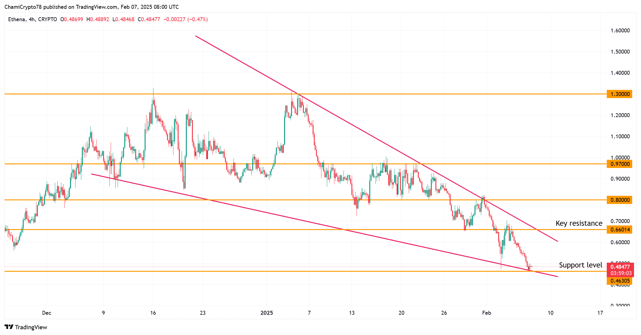 ENA’s price action has been under pressure, recently breaking through several support levels. Currently, the token is testing a critical support level near $0.4847, an important price floor.