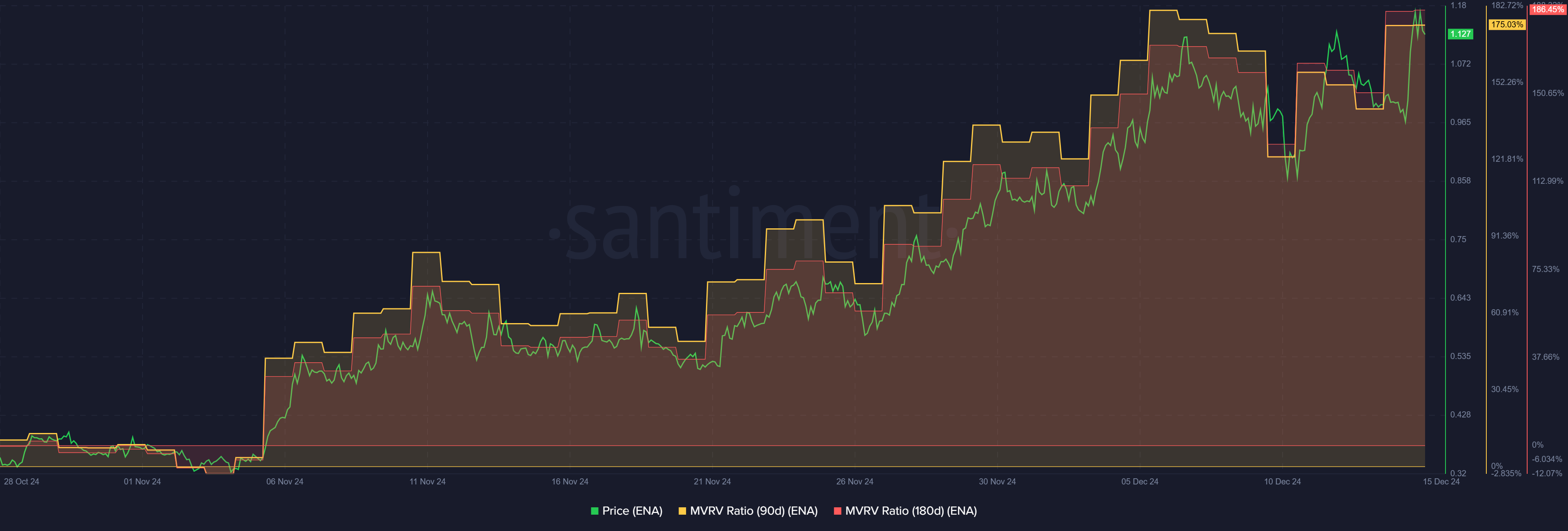 As of this writing, short and mid-term ENA holders had massive triple-digit unrealized profits. This was illustrated by the 186% for 180-day MVRV and 175% gains for 90-day MVRV gains.