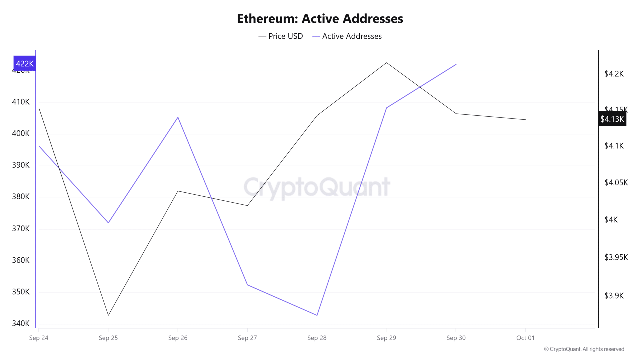 At press time, ETH traded at $4,147, down 1.17% in 24 hours. Yet, while the altcoin’s upside has stalled, transactions, Active Addresses, and whale demand are surging, setting up a clash between weak momentum and strong fundamentals.