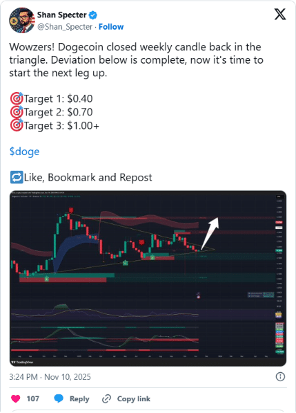Chandler predicts that the price of Dogecoin could go up to $0.30 in the coming 32 days. Another expert, Shan Specter, dropped three price targets for Dogecoin if it breaks out of a symmetrical triangle.