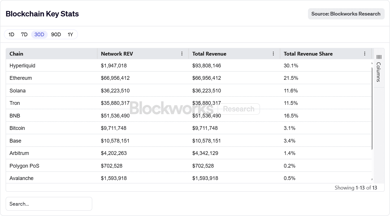 When zoomed out on the broader blockchain ecosystem, Hyperliquid [HYPE] appeared to be still punching above its weight on the app revenue front. In the last 30 days, Hyperliquid netted 30% of the total network revenue, while Ethereum took in 21.5%, according to Blockworks data.