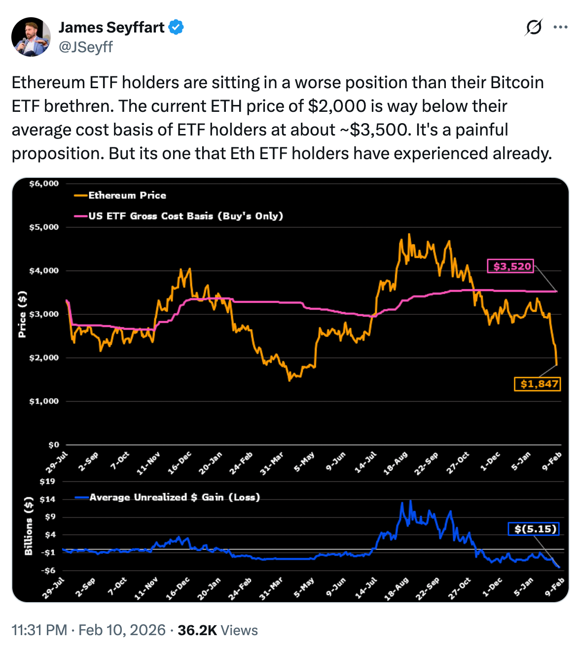 ETF investors are also feeling the pressure. James Seyffart, senior ETF Analyst at Bloomberg, highlighted that Ethereum ETF holders are currently in a worse position than their Bitcoin counterparts.