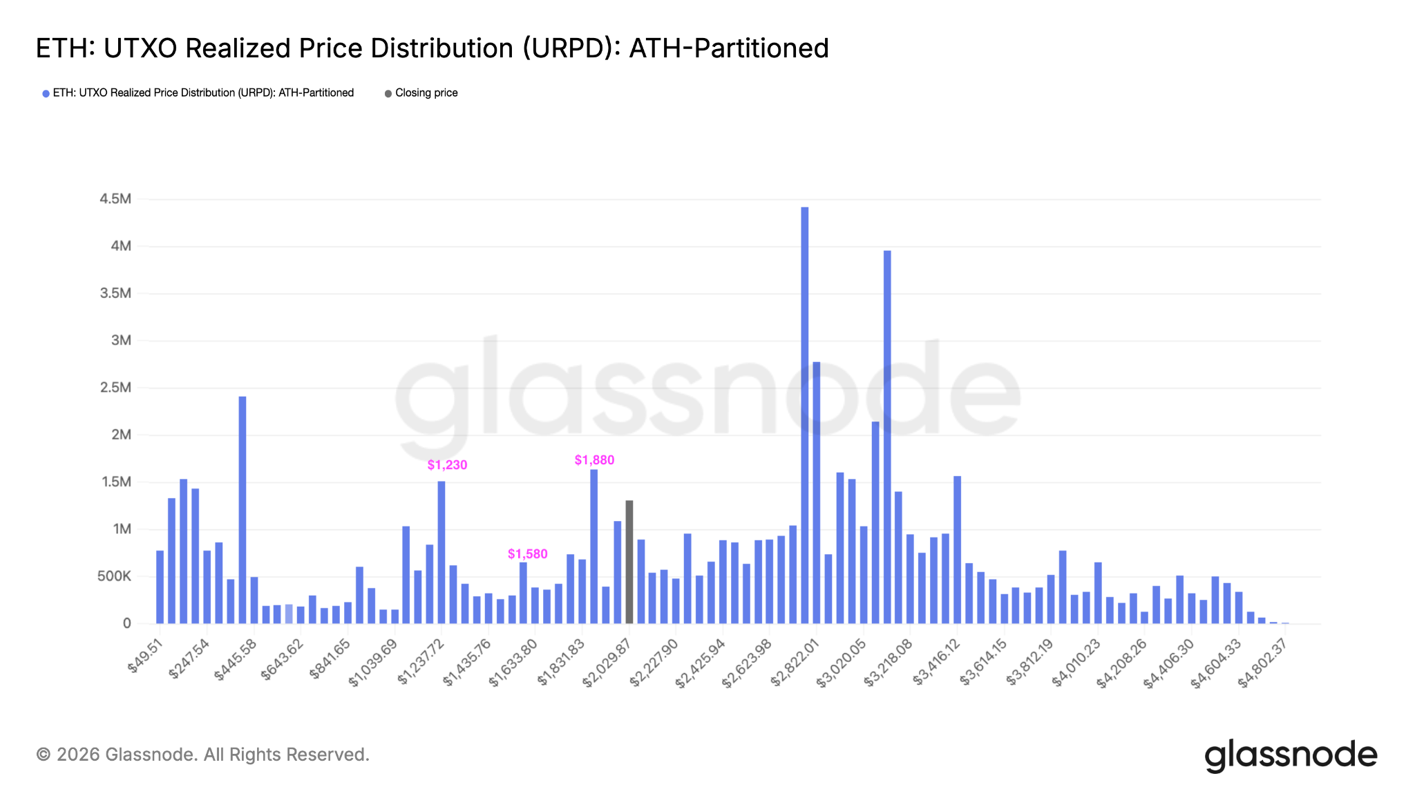 Glassnode’s UTXO realized price distribution (URPD), which shows the average prices at which ETH holders bought their coins, reveals that below $2,000, key support levels for ETH sit at $1,880, $1,580 and $1,230.