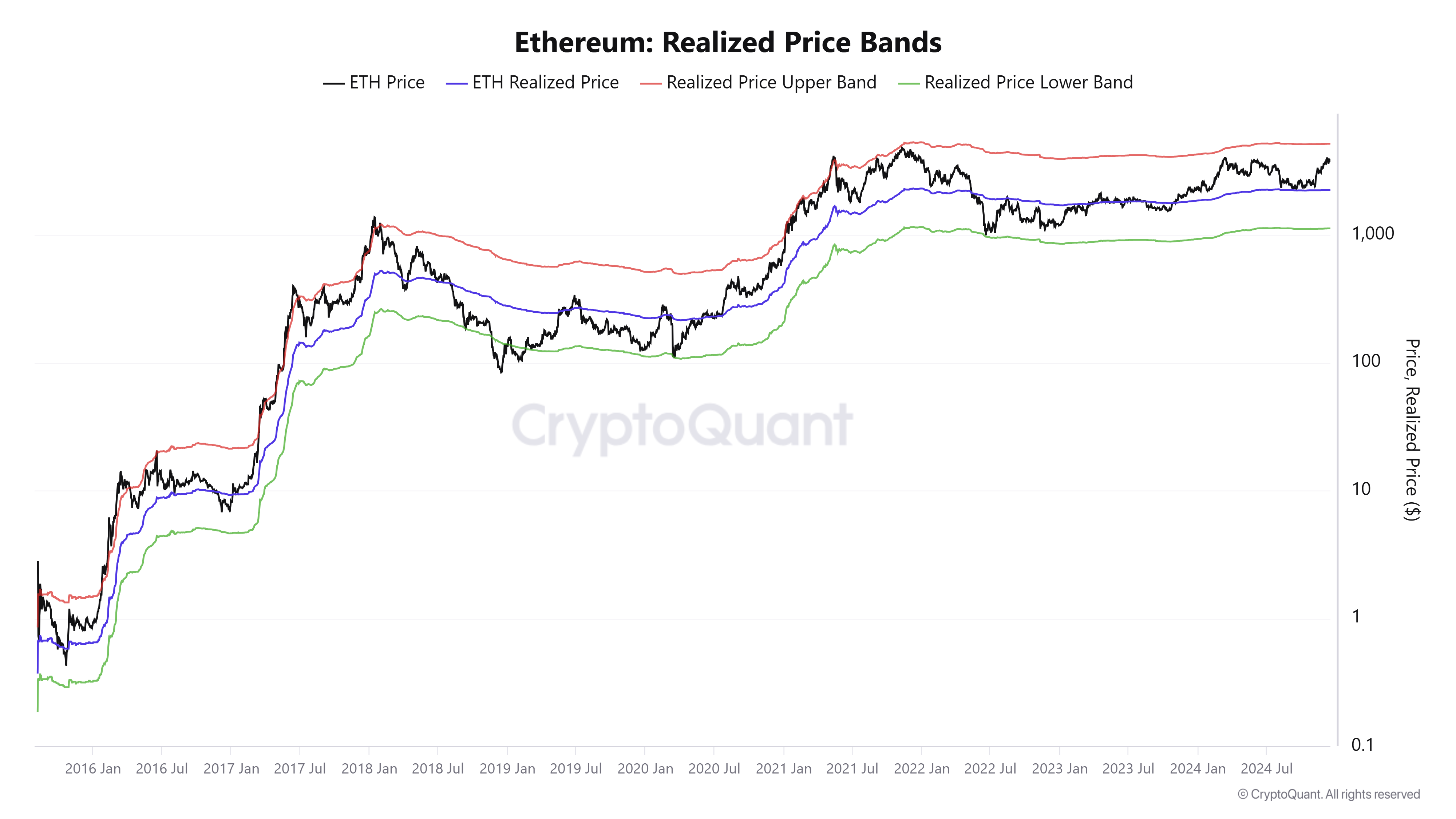 Ethereum’s realized price upper band is a critical marker for market behavior. Currently at $5,200, it marked the peak of ETH’s 2021 bull run.