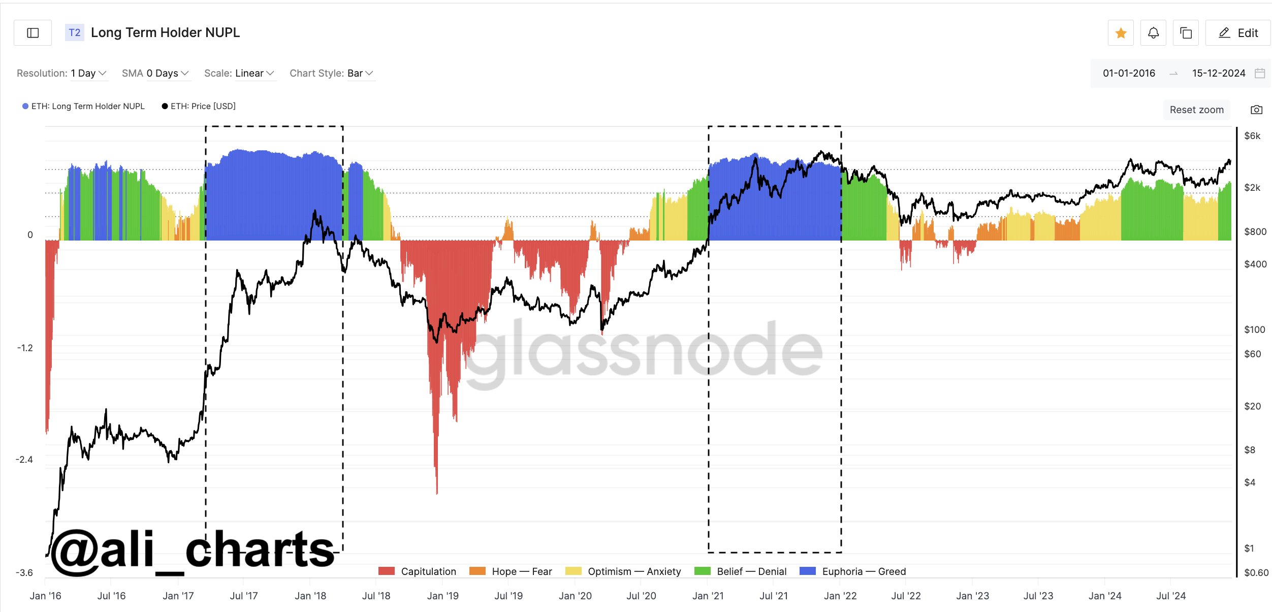 In the last two bull cycles, Ethereum experienced parabolic price surges when long-term holders transitioned into “greed mode”—a stage where market confidence reaches euphoric levels and profit-taking dominates.