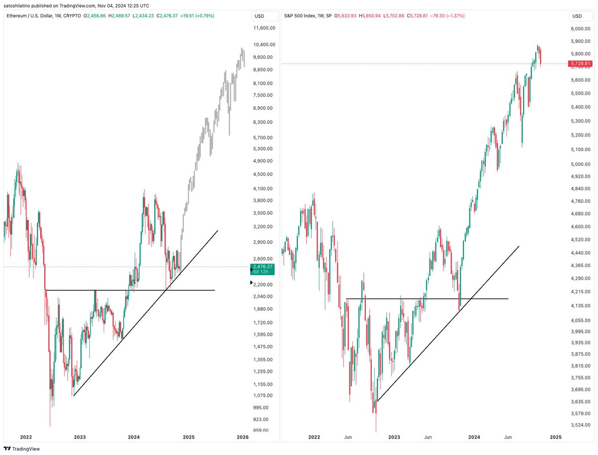 As ETH continues this trajectory, maintaining the S&P500’s course might propel it much higher, potentially leading to a major breakout.