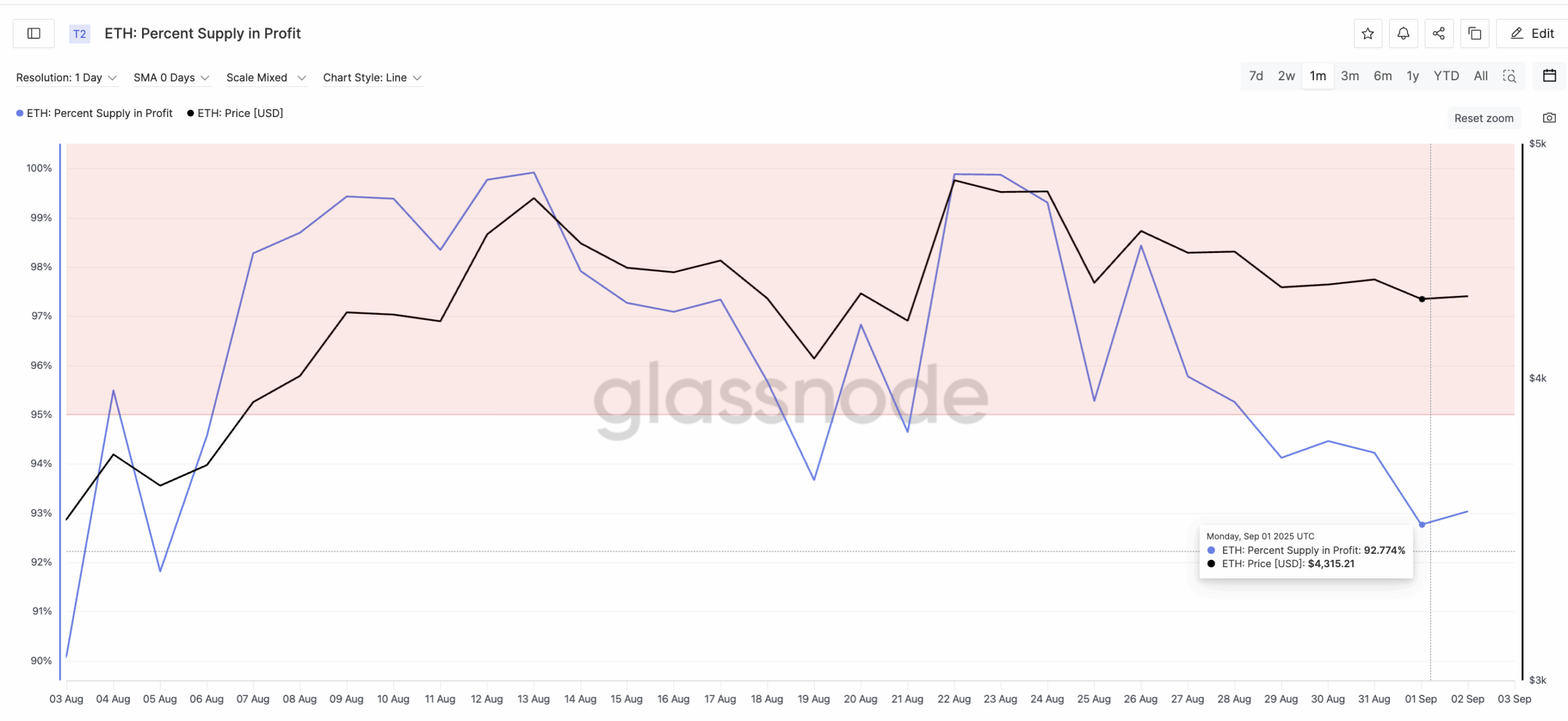The percentage of ETH supply in profit dropped from 98.4% on August 26 to a local bottom of 92.7% on September 1 — its second-lowest reading in a month. Normally, such declines reflect heavy profit-taking. But once profit supply hits local bottoms, ETH has historically rallied. For example, when the ratio fell to 91.8% earlier in August, ETH surged from $3,612 to $4,748 (over 31%) in just eight days.