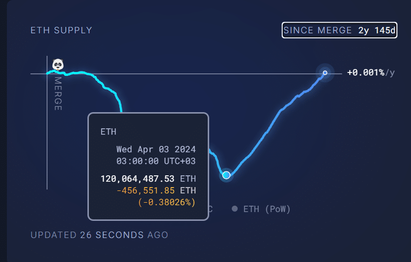 - ETH supply has surged to $120.5M tokens, climbing back to pre-Merge levels.