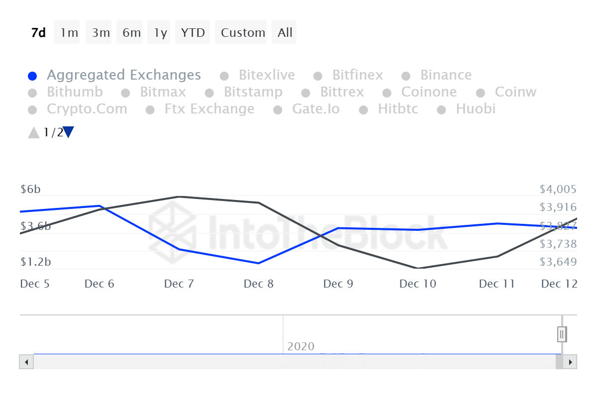 However, since reaching this level, it has experienced a correction and retraced to $3501. As of this writing, Ethereum was trading at $3,899. This marked a 0.6% decline on daily charts.