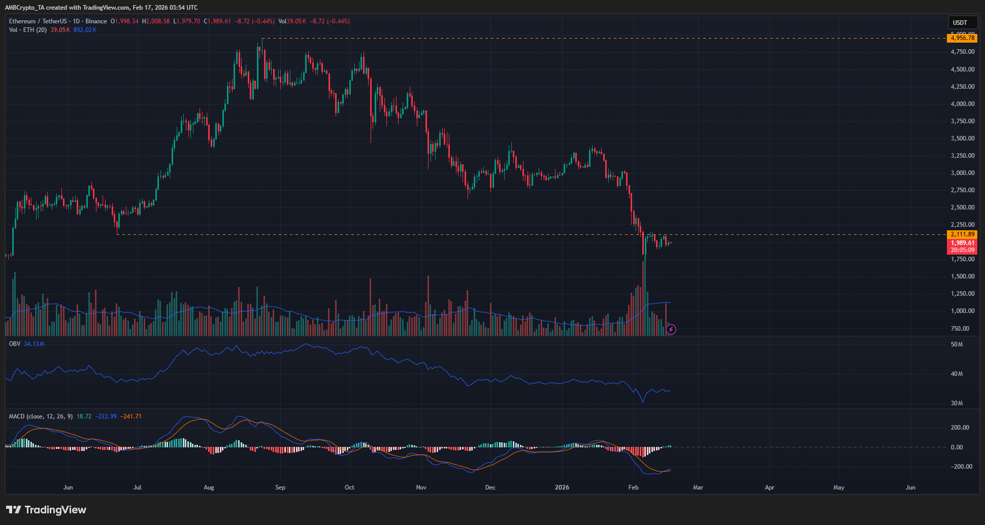 Ethereum [ETH] fell below its long-term swing low at $2,111, set in June 2025. Over the past 10 days, this former low has served as resistance, rebuffing bulls’ attempts to push the prices higher.